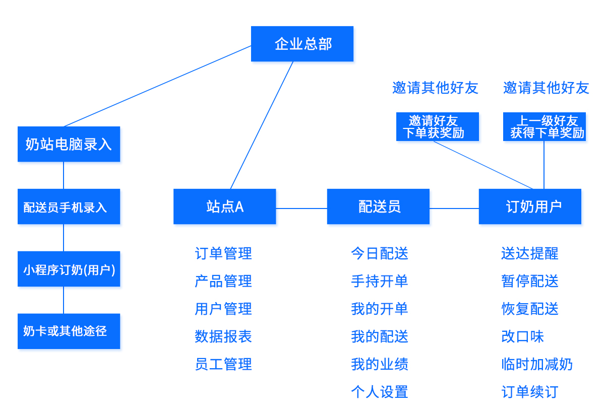 多奶站统一管理或者企业总部统一管理,各奶站单独运营,总部掌握用户及营销数据,更精准分析及开发产品和活动推广