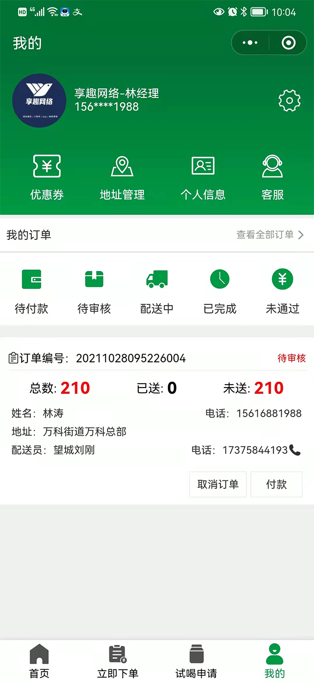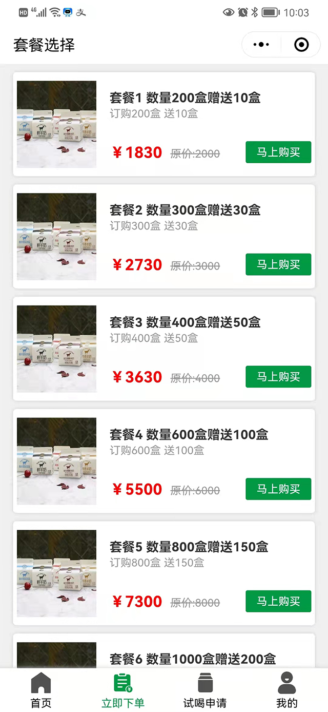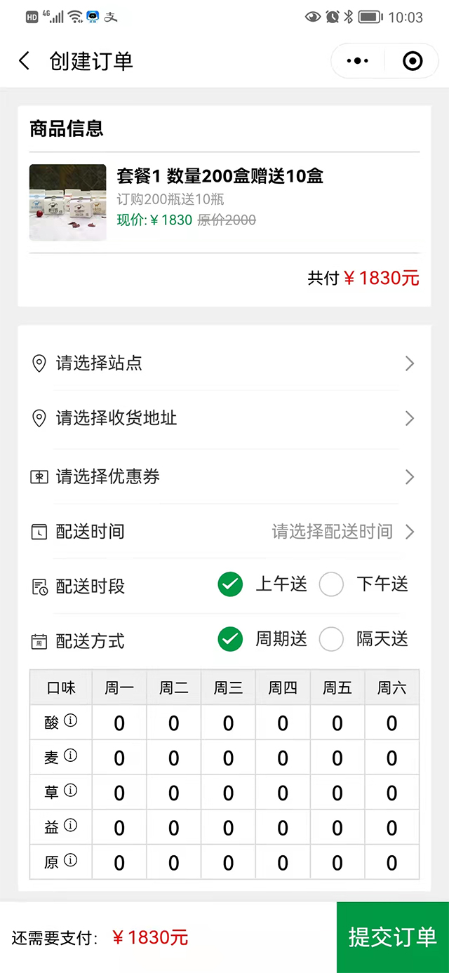 用户可以通过小程序—键订购、支付、查询配送明细、联系配送员、变更口味、停奶等。
