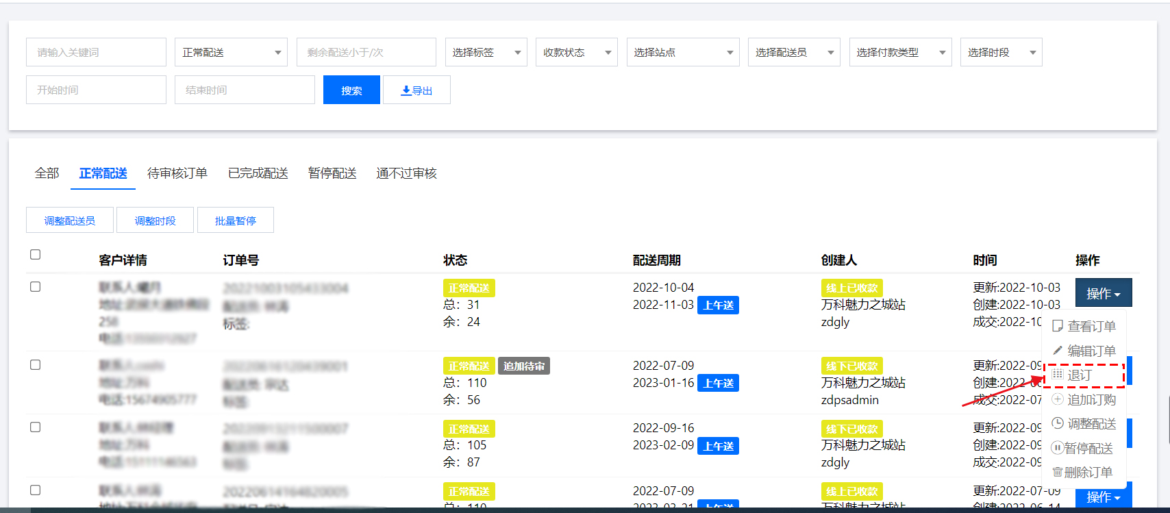 在订单上点击操作—退订