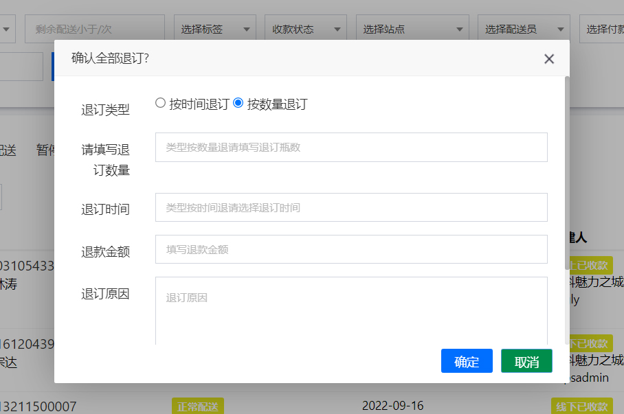 按数量退订:填写的退订数量,系统会根据订单剩余的瓶数去减掉退订的数量