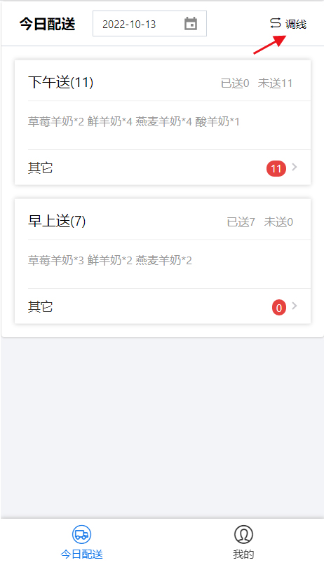 通过公众号配送员登录入口,输入账号和密码登录之后,点击我的—今日配送—调线
