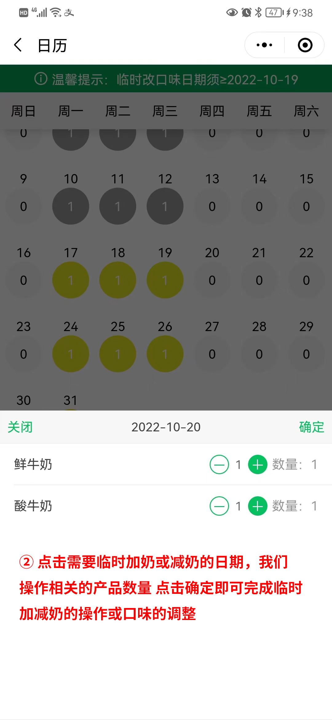 如上图点击具体的日期按照上图的操作即可完成临时加减奶或临时口味的调整操作。